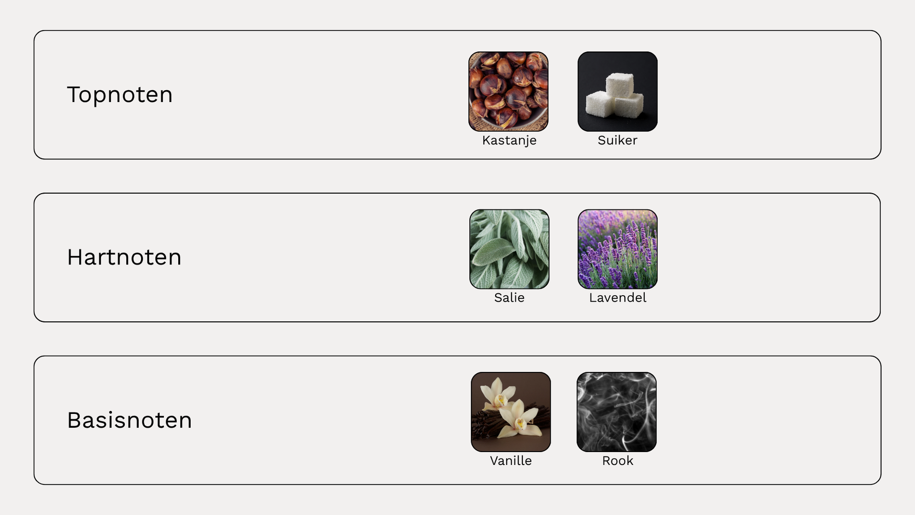 Ein sanfter und wohltuender Duft, der mit gerösteten Kastanien und Kristallzucker beginnt und an die Wärme einer Patisserie im Morgengrauen erinnert. Aromatische Wellen von Salbei und Lavendel verleihen eine klare, krautige Herznote, bevor sie in eine gemütliche Basis aus reichhaltiger Vanille und leichten Rauchschwaden übergeht. Das Ergebnis ist eine feine Balance zwischen Süße, Nussigkeit und aromatischer Wärme, umhüllt von einem leicht pudrigen Abgang.