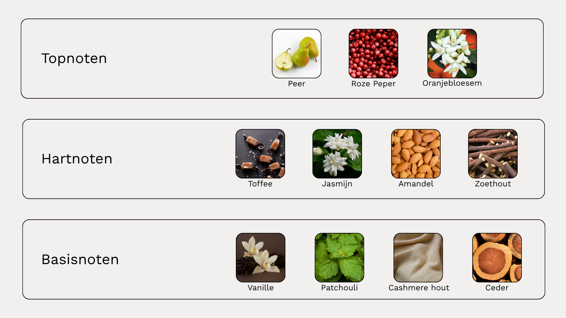 Ein strahlender Auftakt aus Birne und rosa Pfeffer weicht einer Herznote aus zartem Toffee, zartem Jasmin und gerösteten Mandeln. Im weiteren Verlauf hinterlassen sanfte Vanille, Patschuli und Kaschmirholz einen warmen, bleibenden Eindruck.