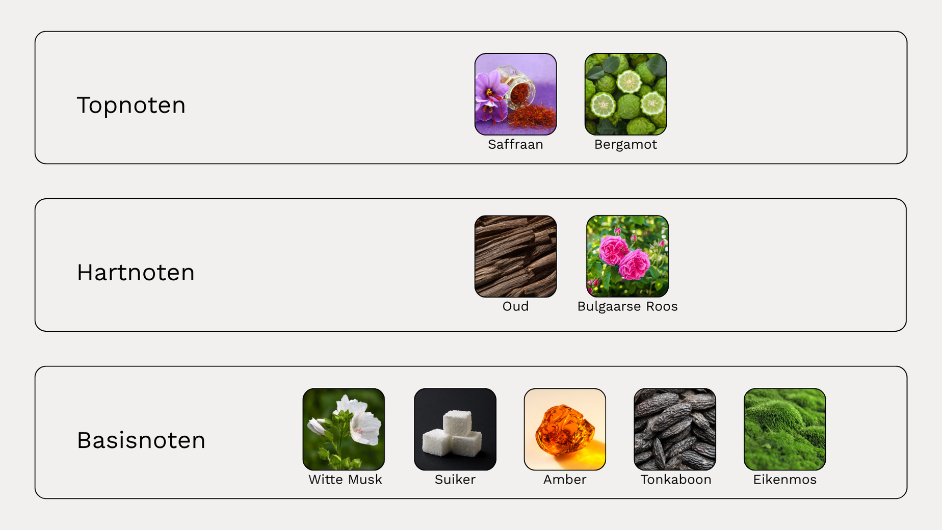 Safran und Bergamotte eröffnen mit strahlender Wärme und verschmelzen mit einem floralen Herzen aus bulgarischer Rose und rauchigem Adlerholz. Im weiteren Verlauf entfalten sanfter Amber, Zuckerrohr und Tonkabohne einen Abgang, der sowohl zart als auch zutiefst süchtig macht.