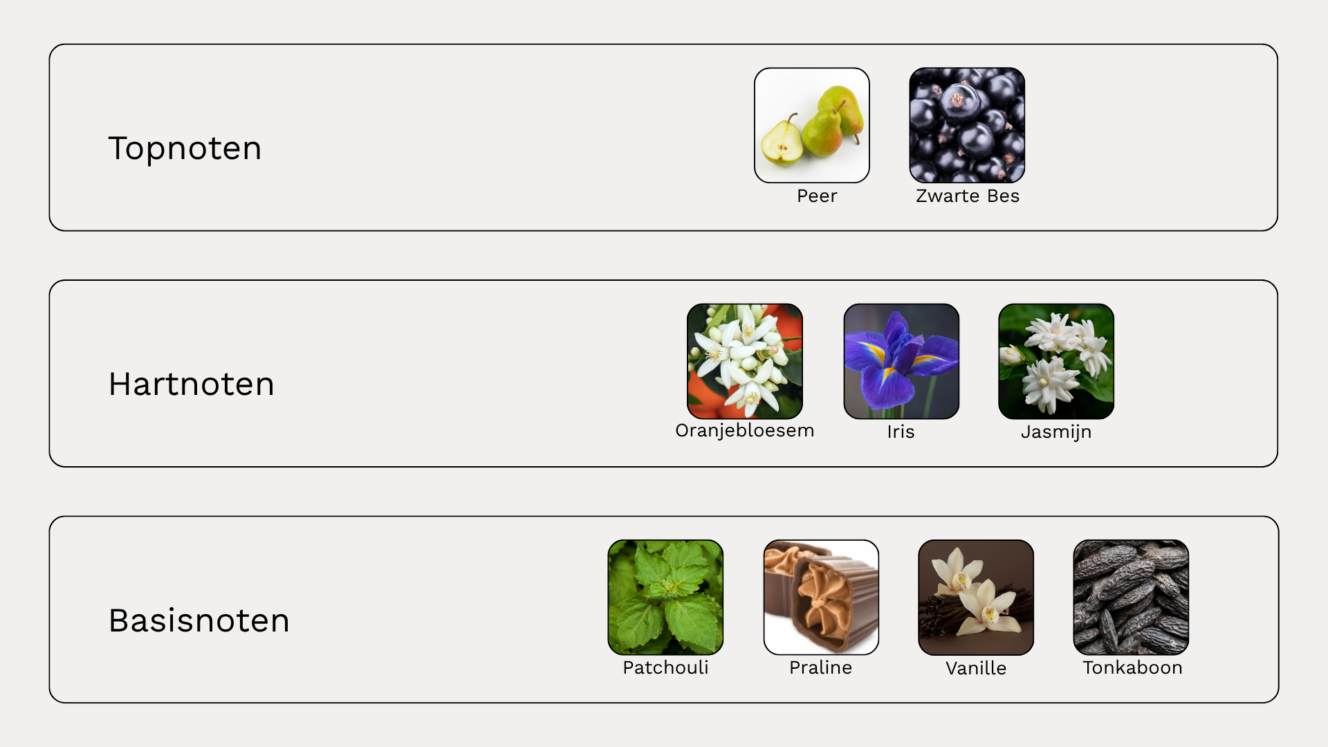 Eine köstliche Mischung aus cremiger Süße und zarten Blumennoten. Dieser Duft eröffnet mit der saftigen Frische von schwarzer Johannisbeere und Birne. Im Herzen verleiht ein raffiniertes Trio aus Iris, Jasmin und Orangenblüte pudrige Eleganz, während eine Gourmet-Basis aus Praline, Vanille und Tonkabohne durch erdiges Patschuli geerdet wird. Das Ergebnis ist ein warmer, süchtig machender Duft mit verspieltem Charme und samtiger Tiefe.