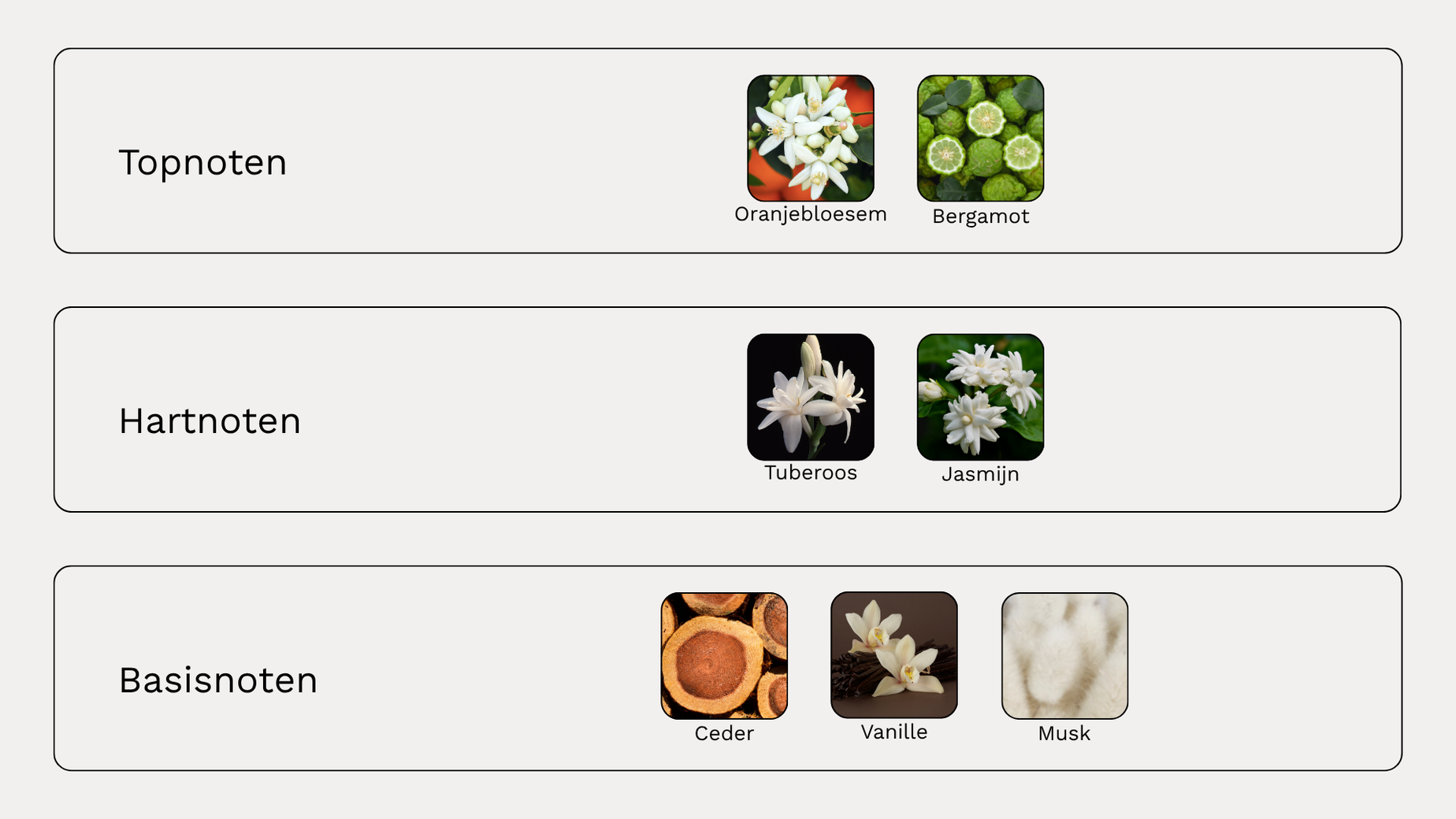 Bergamotte und Orangenblüte eröffnen mit einer klaren Zitrusnote und weichen einem strahlenden floralen Herz aus Tuberose und indischem Jasmin. Im weiteren Verlauf sorgen sanfte Vanille, weißer Moschus und Virginia-Zeder für einen cremigen, hautnahen Abgang – elegant und gelassen.