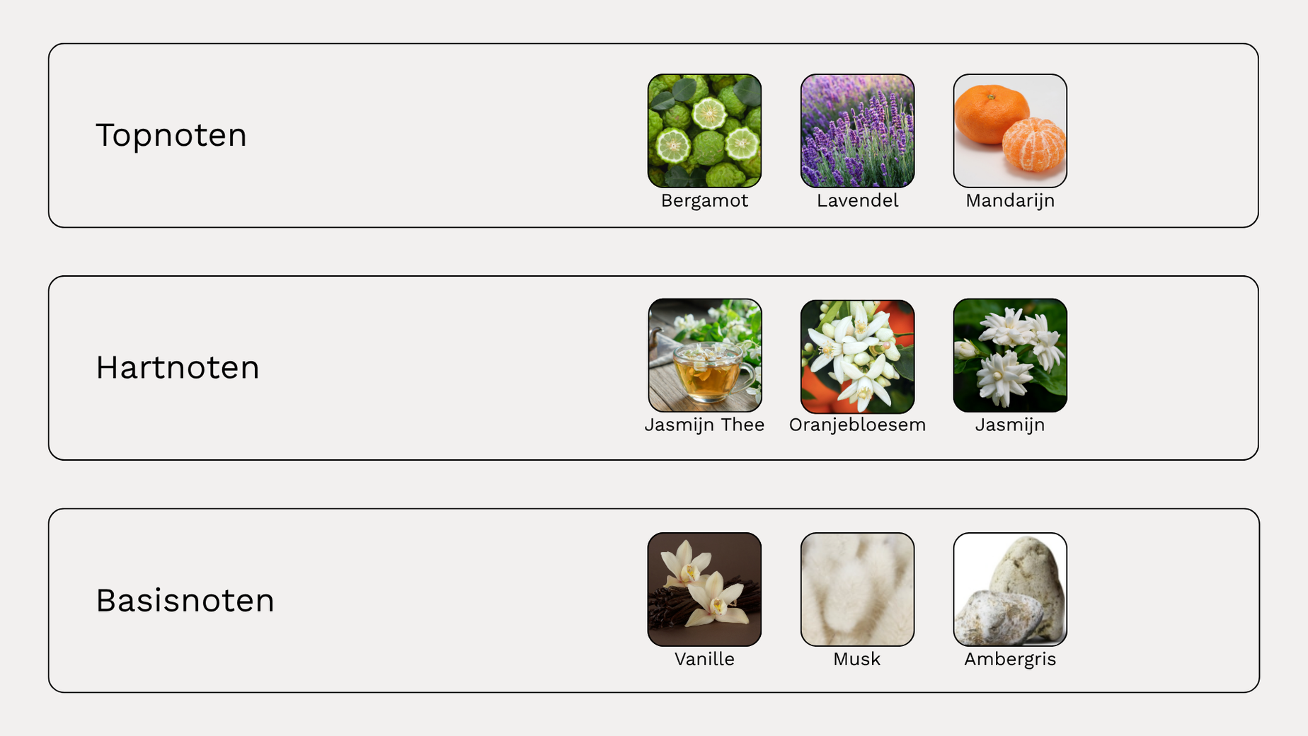 Dieser Duft ist eine leuchtende und raffinierte Mischung. Er beginnt mit frischem Lavendel, Zitrusfrüchten und schwarzer Johannisbeere. Die Herznote entfaltet sich zu einem eleganten Blumenbouquet aus Jasmin und Orangenblüte, bevor er in eine weiche, moschusartige Basis aus Vanille, Zeder und Ambra übergeht. Klar und doch sinnlich, balanciert er leichte Blumennoten mit warmer, hautähnlicher Tiefe.