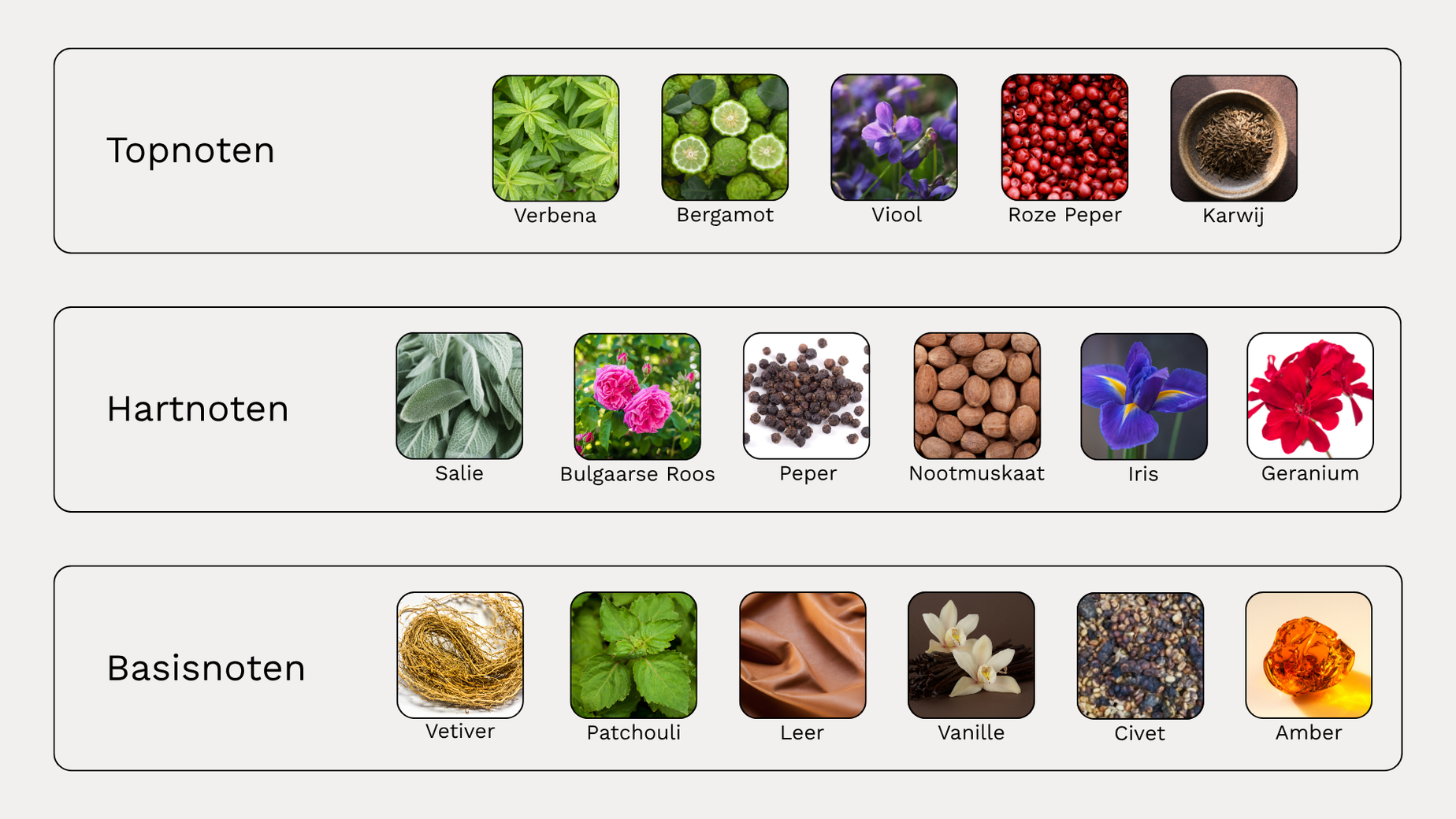 Aromatisch und grün im Auftakt, beginnt dieser Duft mit Veilchenblättern, Bergamotte und einem Hauch von rosa Pfeffer. Die Herznote offenbart eine würzig-blumige Wärme mit toskanischer Iris, Rose, Muskatnuss und Muskatellersalbei. Im Abklingen verschmelzen cremiger Amber und Vanille mit Patschuli, Leder und Opoponax, geerdet durch erdiges Vetiver und einen Hauch Zibet.
