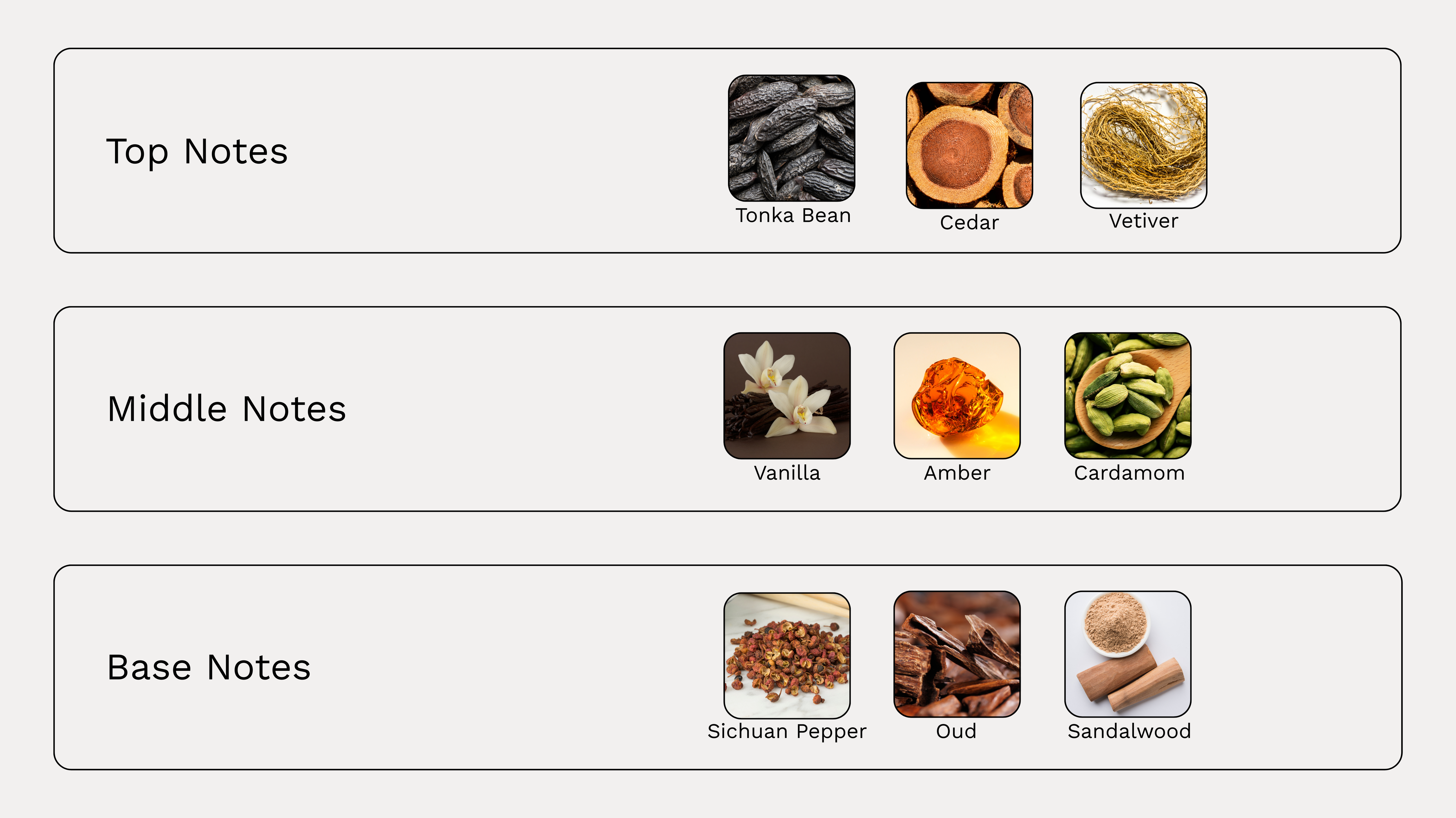 A rich blend of smoky agarwood and creamy sandalwood opens with warmth and depth, accented by the sharp brightness of cardamom and Sichuan pepper. As it unfolds, a resinous heart of rosewood and velvety vanilla transitions into a dry down of earthy vetiver, smooth tonka bean, and golden amber — grounding the scent in a spicy, woody trail with subtle sweetness.