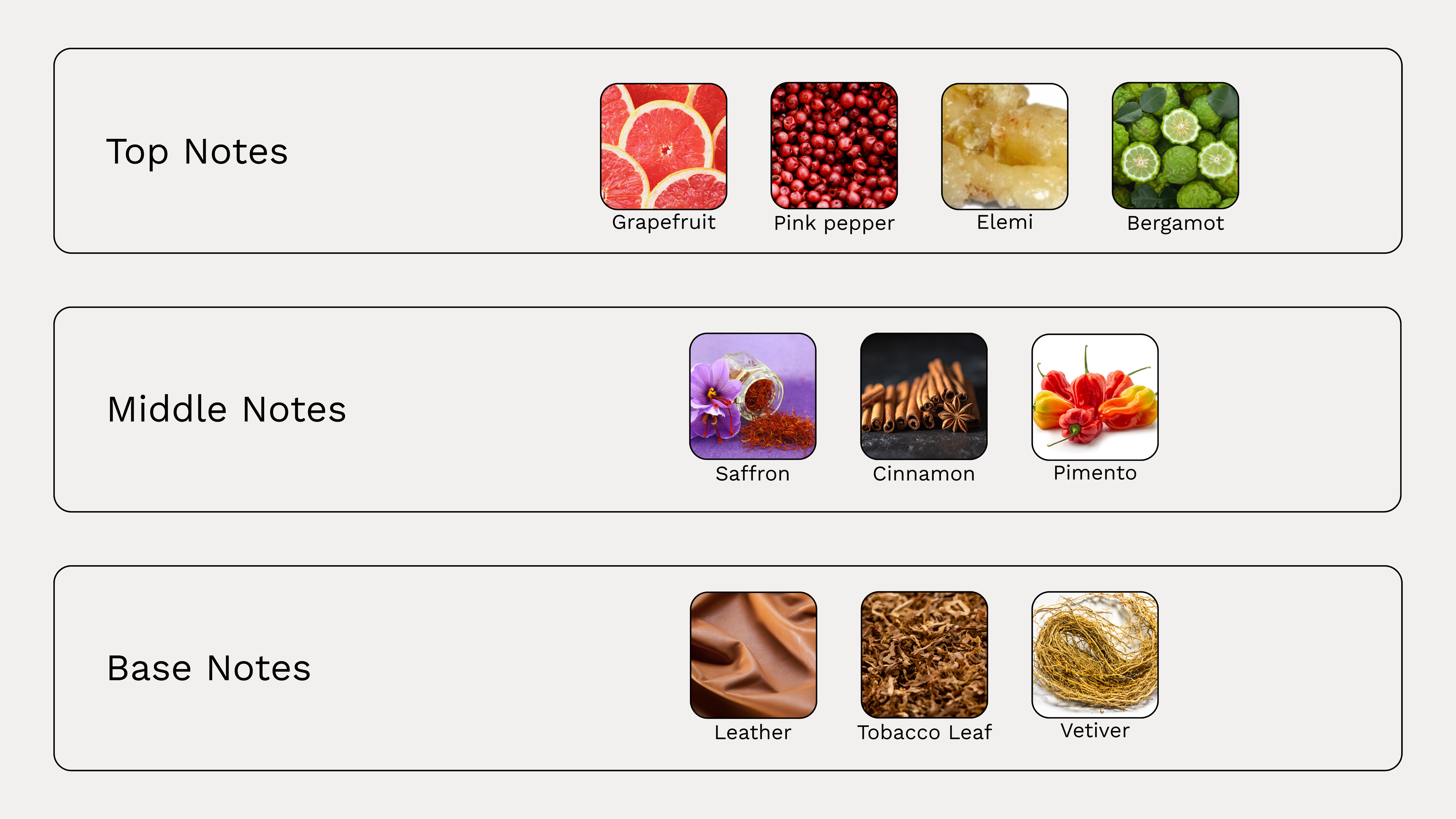 A daring and dynamic composition, this fragrance sets a fiery tone from the start with a bold rush of pink pepper, sharp citrus peels, and the glint of elemi. The heart smolders with the bite of cinnamon, while saffron and paprika weave an exotic, spicy trail. As it dries down, the scent deepens into smoky tobacco, textured leather, and earthy vetiver — grounding the initial spice in an irresistibly masculine base. This is a scent of intensity and heat, refined with depth and edge.