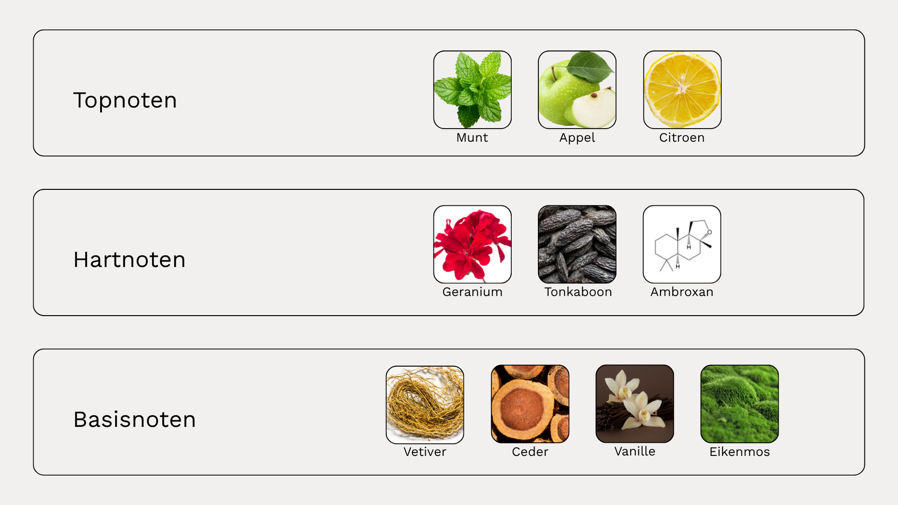 Onze geuren zijn zelfstandig ontwikkelde parfumoliecomposities en zijn niet identiek aan enig origineel merkproduct. Eventuele overeenkomsten in geurbeleving zijn uitsluitend van functionele en referentiële aard.