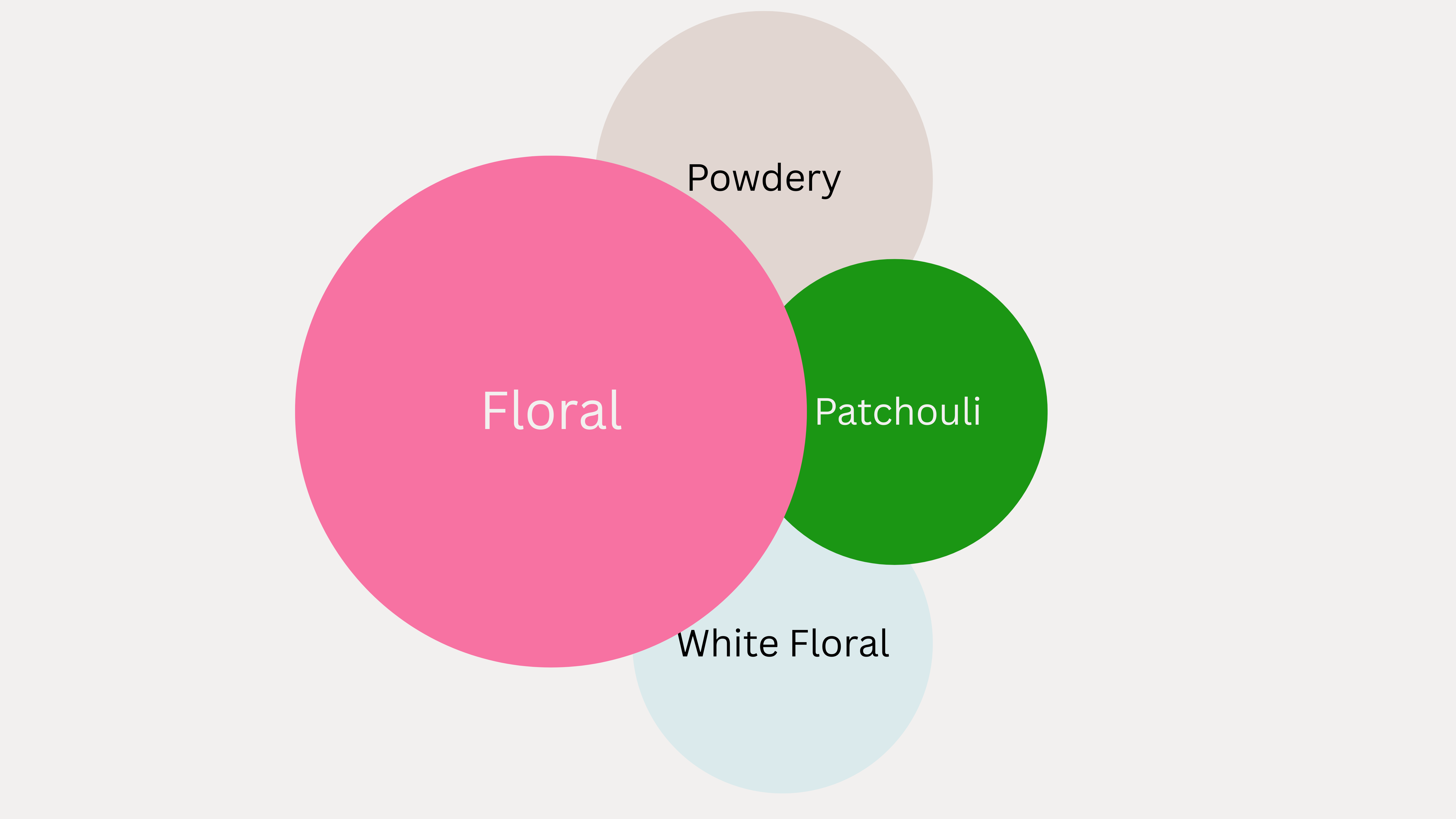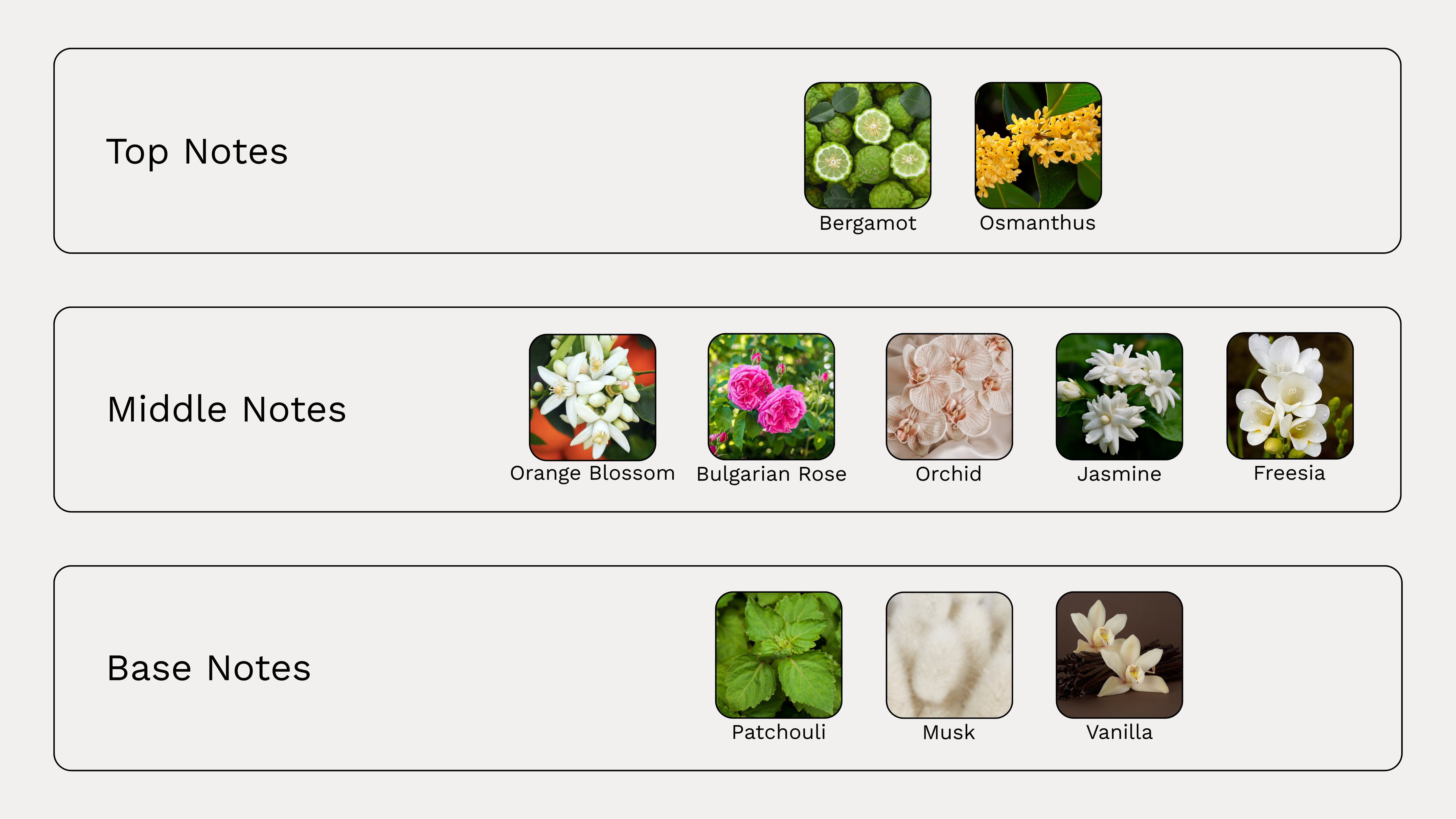 A bright floral heart blooms around jasmine, orchid, and rose, softened by powdery freesia and warmed with tea and citrusy bergamot. Patchouli and vanilla lay down a gentle, musky base for a smooth, modern finish.