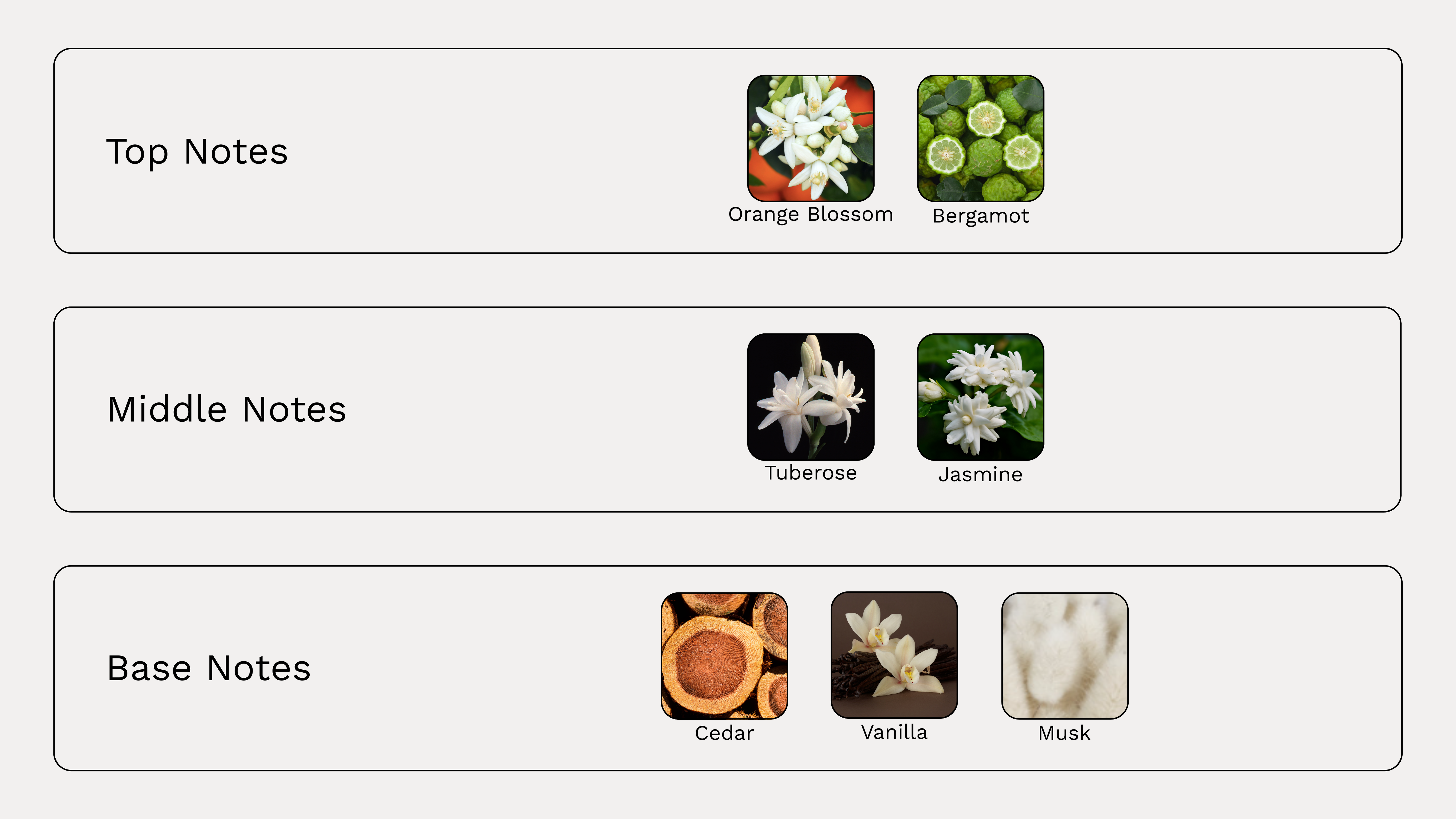 Bergamot and orange blossom open with a clean citrus brightness, giving way to a radiant floral heart of tuberose and Indian jasmine. As it settles, soft vanilla, white musk, and Virginian cedar create a creamy, skin-close finish — elegant and serene.